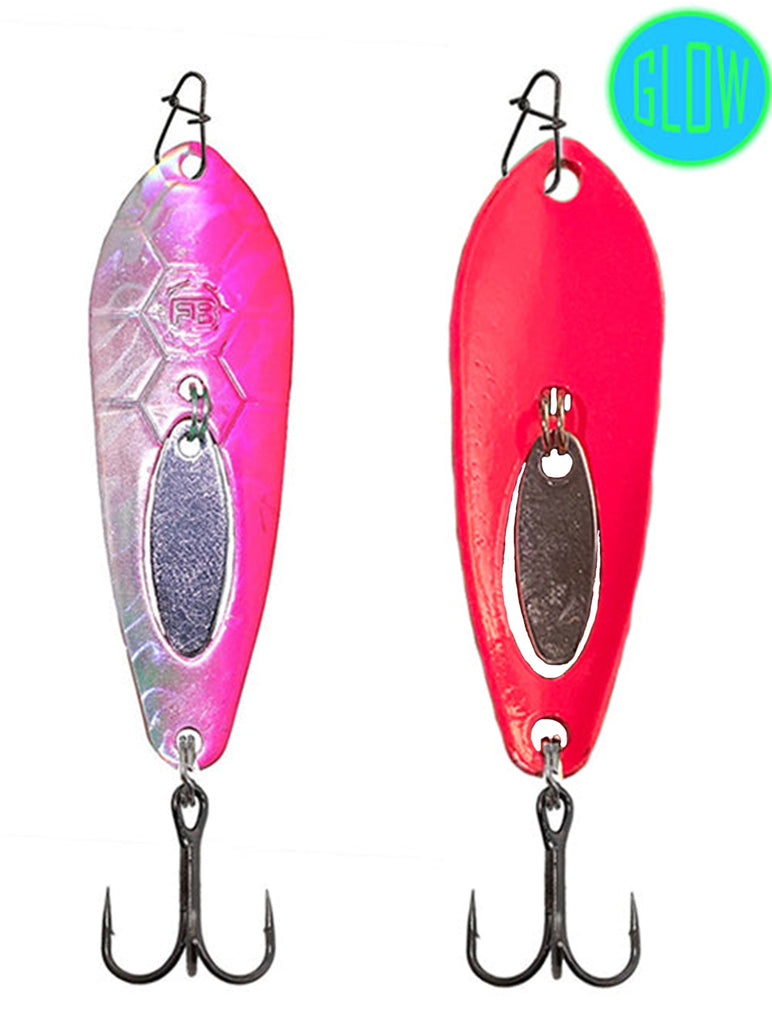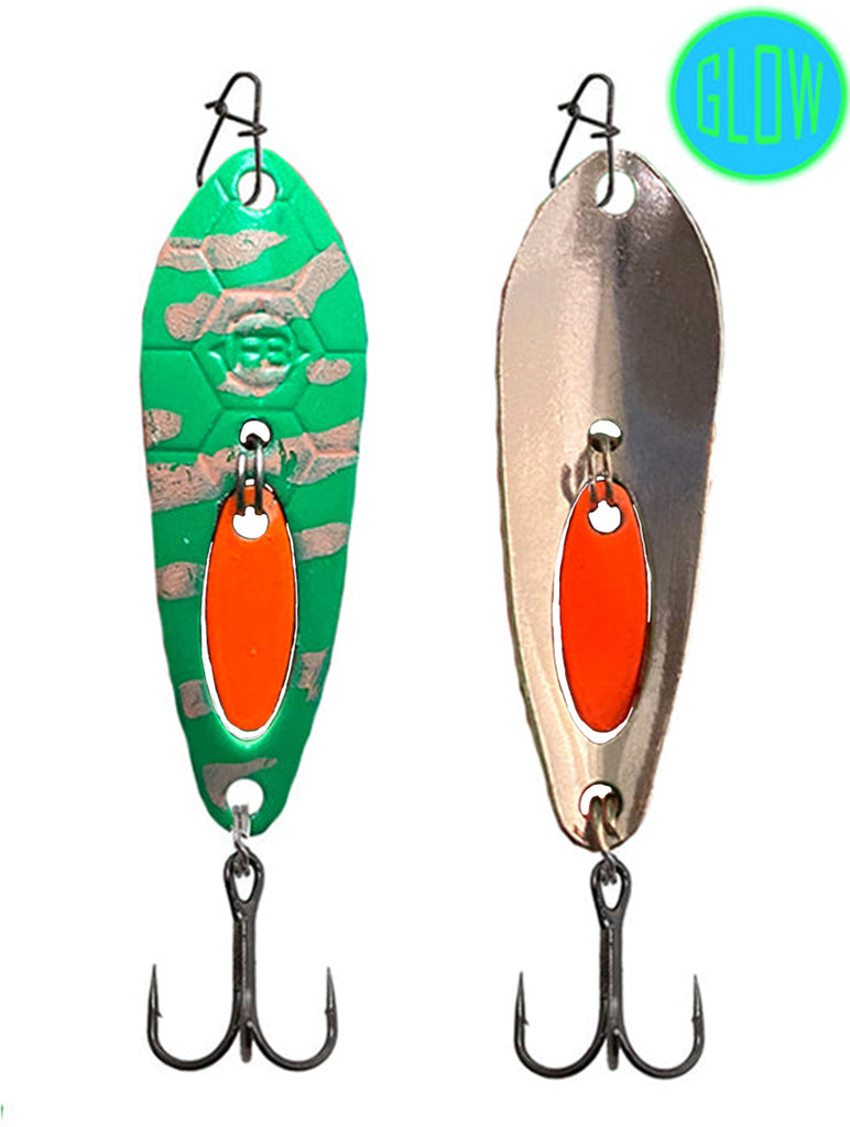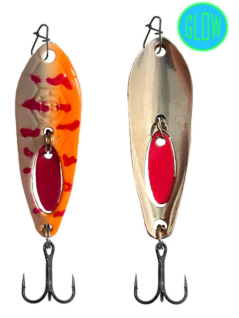 The Dinner Bell is a catch-all spoon! The noise and commotion caused by the inner blade offers a truly unique action with lifelike appeal. This is a fantastic jigging (or casting or trolling) lure for targeting Walleye, Panfish, Trout, Bass, Pike, and many more. Choose from 12 proven colors, with 6 signature GLOW patterns, that all have premium black nickel components, including the sharpest, strongest treble hooks available and a low profile cross-lock snip snap.