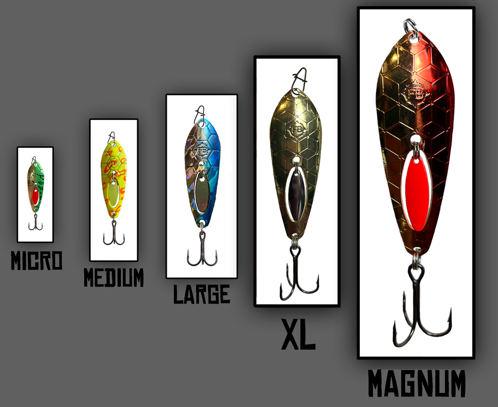 3" - 3/4oz The XL dinner bell is a catch-all spoon! The noise and commotion caused by the inner blade offers a truly unique action with a lifelike appeal. Jigged, casted, or trolled, this spoon is the choice for an upsized presentation.
